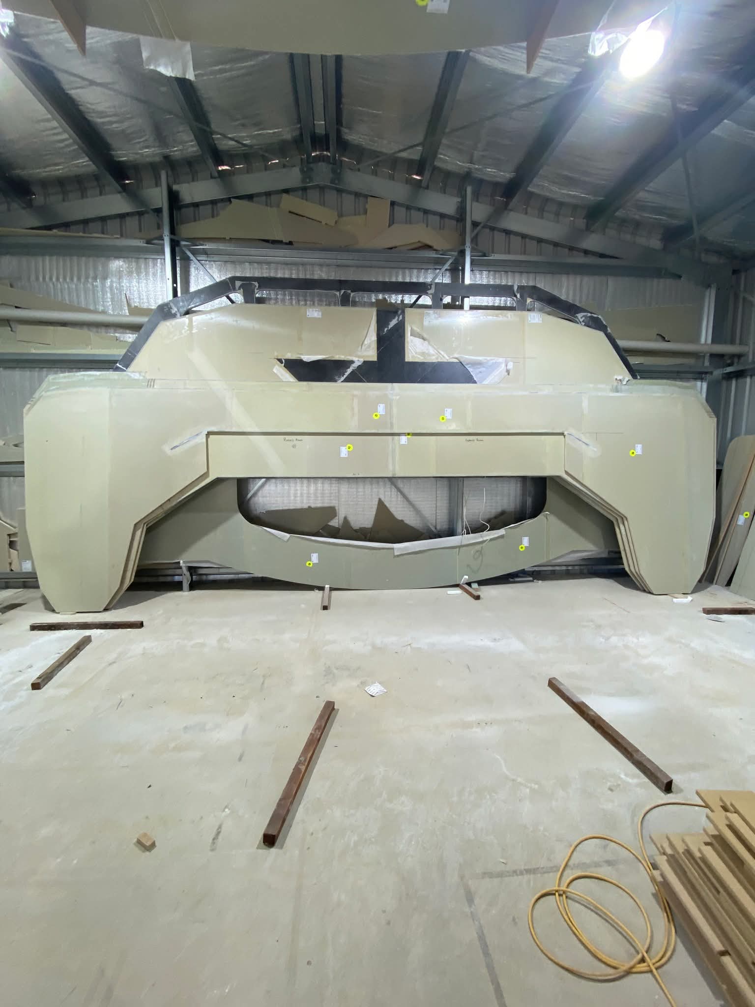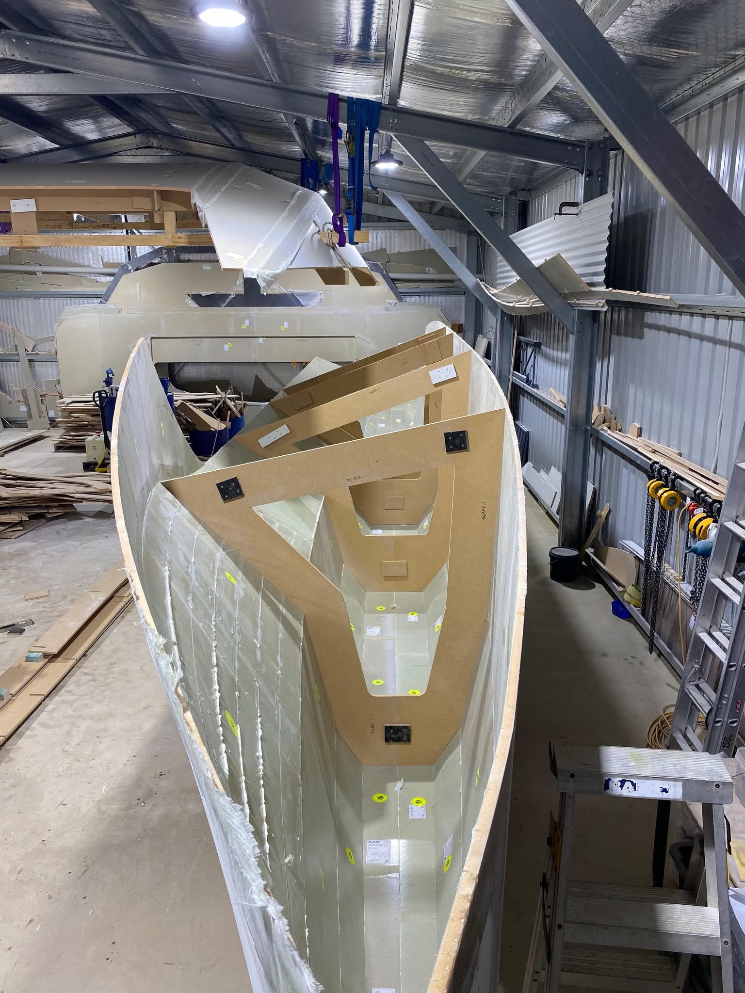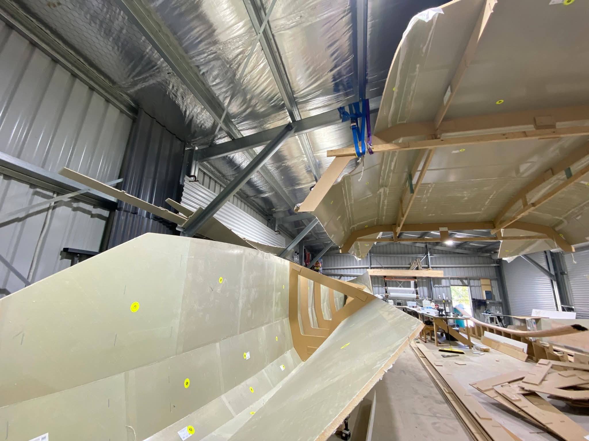 We are fortunate to already have a shed on our property (16m x 10m), where we have been building our yacht. We knew space would become tight very quick once hulls were constructed, so after the initial joining of all panels, we first built the cabin top and hoisted into the roof on completion.